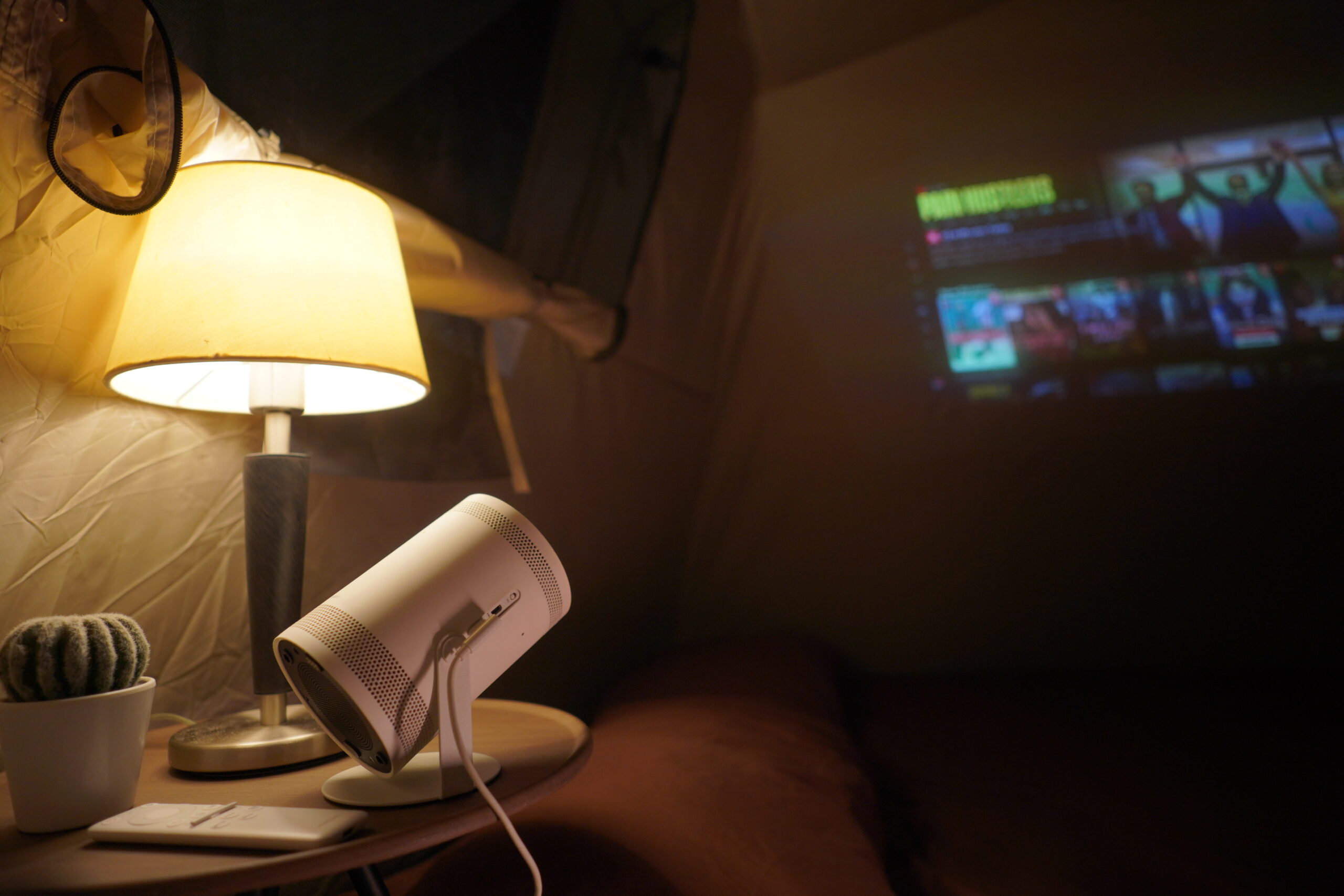 Enjoy movie night with our 100 inch smart projector and high quality speaker.
